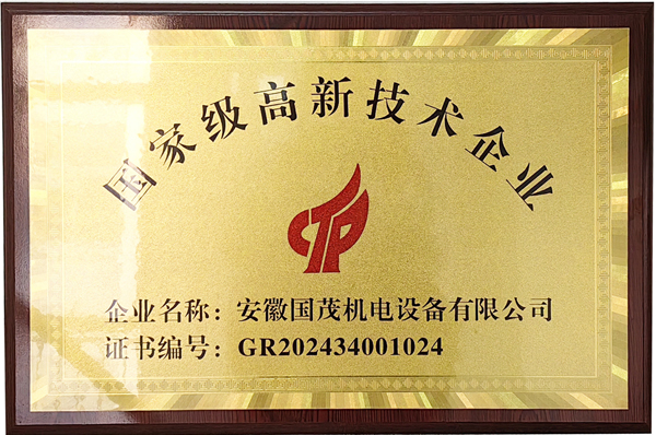 此次荣获“国家级高新技术企业”认定,是对安徽国茂机电设备有限公司过去成绩的肯定,更是对公司未来发展的鞭策。 公司将以此为契机,继续加大研发投入,加强技术创新,不断提升产品技术含量和市场竞争力,为客户提供更优质的产品和服务,为推动行业技术进步和经济社会发展做出更大的贡献!