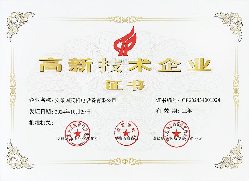 国家级高新技术企业认定是国家为扶持和鼓励高新技术企业发展而设立的一项重要资质认定,对企业的核心自主知识产权、科技成果转化能力、研发组织管理水平以及企业成长性等指标有着严格的要求。安徽国茂机电设备有限公司能够获此殊荣,是公司长期以来坚持科技创新、注重研发投入、不断提升核心竞争力的结果。