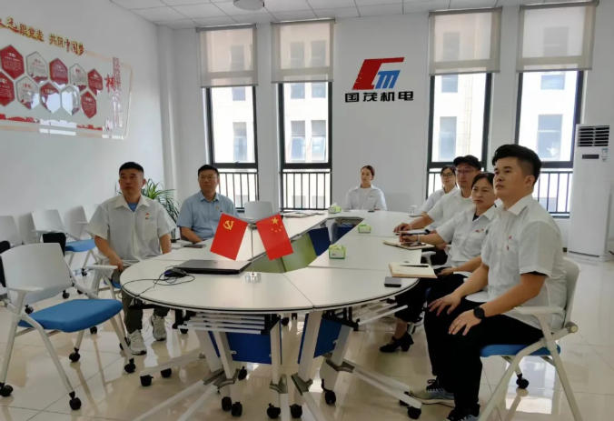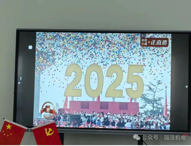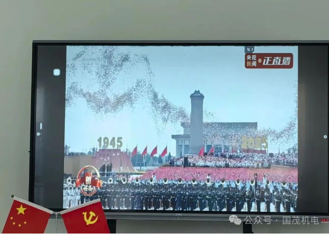 为纪念中国人民抗日战争暨世界反法西斯战争胜利80周年,2025年9月3日国茂机电公司组织员工观看阅兵仪式。当庄严的国歌奏响,全体员工神情肃穆,目光坚定地注视着屏幕中的画面,心中满是对祖国的热爱与敬意。
