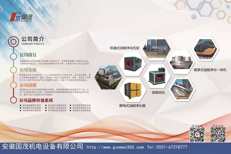 安徽国茂机电设备有限公司致力于厨房油烟净化领域,建立广泛的知名度,本着利他的服务理念,塑立国茂品牌价值。其中,主要核心部件自主研发、生产,不断创造,从运水烟罩式到静电式,再到现在的复合式油烟净化一体机,一代更比一代效率高、维护简单方便。国茂团队怀着“空杯”的心情,认真专研,站在风口,为用户提供更贴心、更专业的品牌化服务。用生命捍卫产品的质量,努力用风创造价值,使每一个生命空间变得更安全、更环保、更健康、更幸福!
