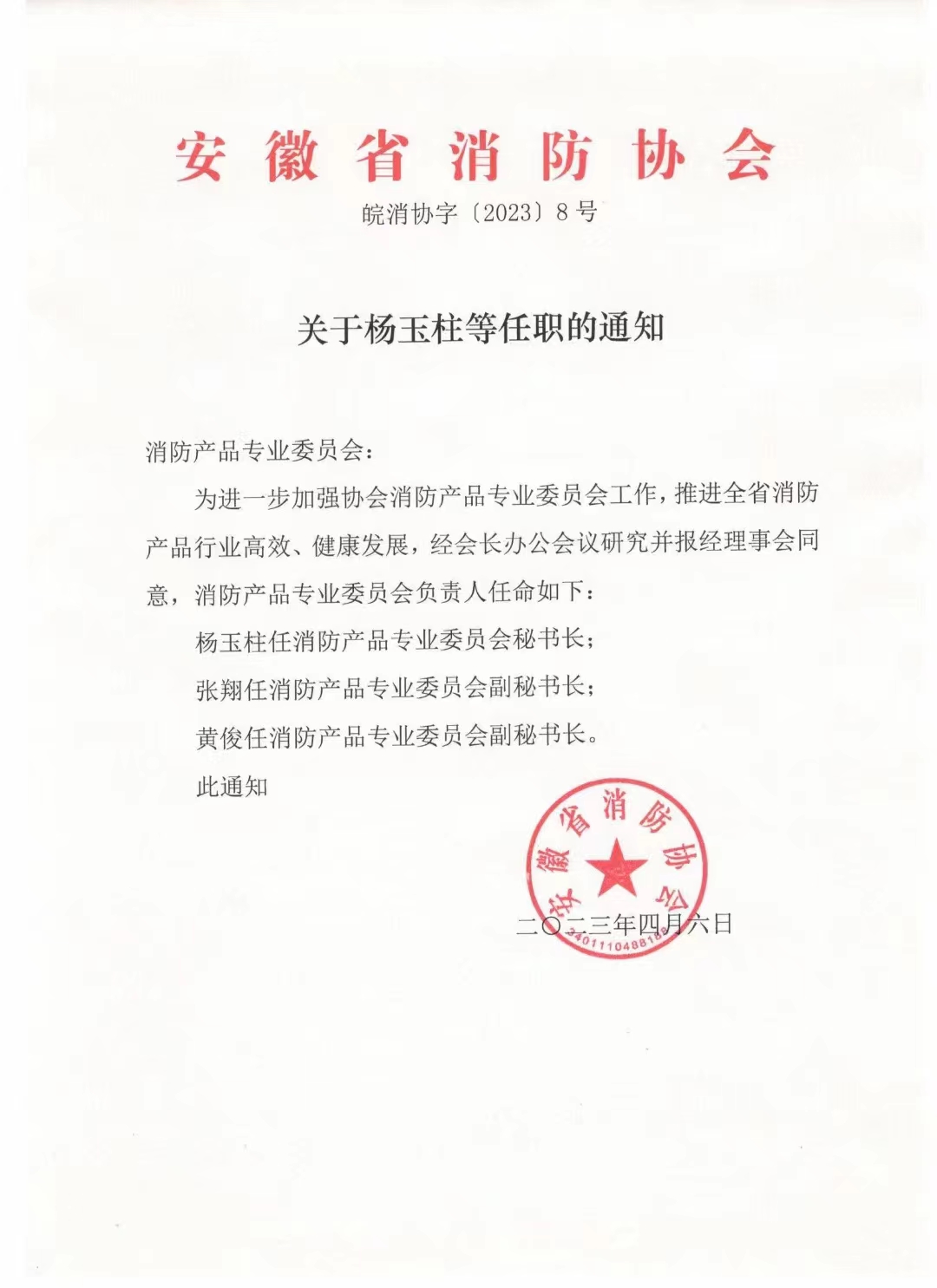 杨玉柱任消防产品专业委员会秘书长;